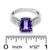 In the most sophisticated and elegant shape, a 10.0 x 8.0mm vintage-enthused emerald-cut amethyst crowns the center of this lovely 10K white gold ring. Remarkable purple hues shine through the gemstone amid a collection of sparkling lab-created white sapphires. Stately, romantic and full of beauty, nothing expresses love like her birthstone, amethyst, in February.